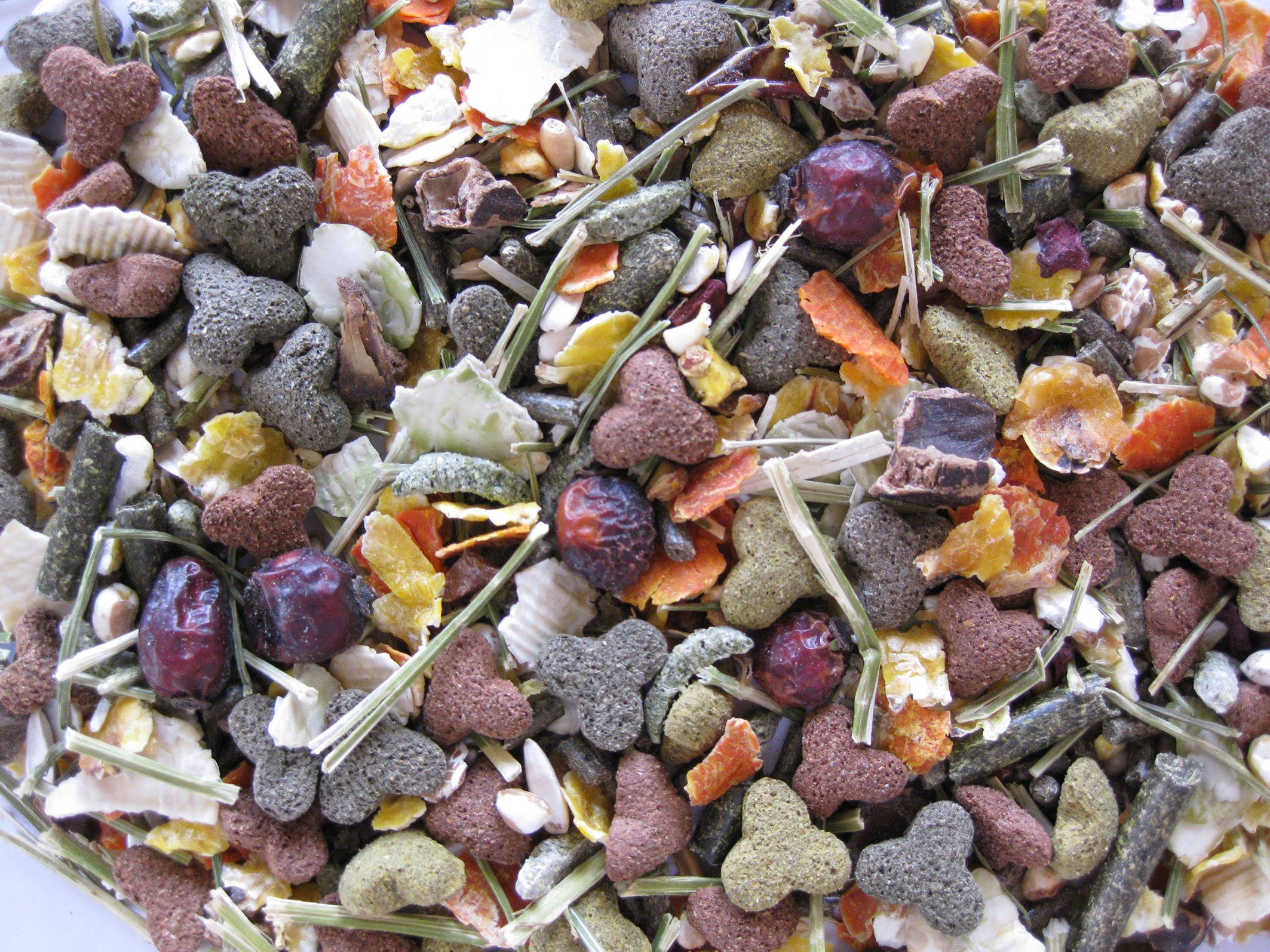 Plantaardige bijproducten (13% luzerne, 6% timothee hooi, 3% luzernestro, 0,8% kruiden (peterselie, weegbree, brandnetel, paardenbloem, echinacea, kamille, kurkuma, oregano)), groenten (12,7% erwten, 2% johannesbrood 1,1% wortel gedroogd, 1% pastinaak gedroogd, 0,1% rode biet gedroogd), granen, vruchten (3% rozenbottel), zaden, mineralen, oliën en vetten.